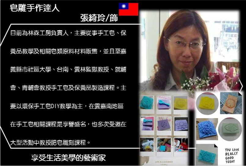 張綺玲老師,目前為林森工房負責人,主要從事手工皂、保養品教學及相關皂類原料材料販售,並且至嘉義縣市社區大學、台南、雲林監獄教授、就輔會、青輔會教授手工皂及保養品製造課程。主要以環保手工皂DIY教學為主,在雲嘉南地區在手工皂相關課程是享譽盛名,也多次受邀在大型活動中教授肥皂雕刻課程。
